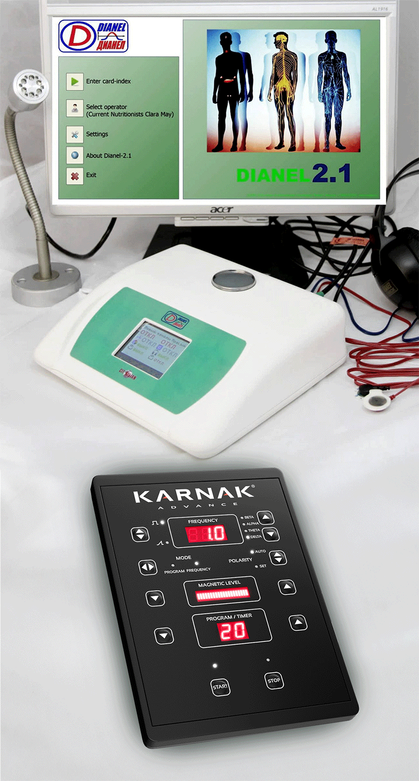 KARNAK® Rigeneratore : biotecnologia brevettata di nuova generazione che genera campi elettromagnetici pulsati a bassa frequenza e bassa intensità per accordare specifiche funzionalità dell'organismo e favorire l'attività cellulare, ormonale, psichica ed emozionale. L'azione delle biofrequenze in combinazione con l'informazione luminosa a led ottimizza la ricettività cellulare perchè trasmette gli stimoli vitali attraverso il linguaggio nativo cellulare. Si usano applicatori o cuffie, collegati a un sensore e un software, dove avviene lo scambio di informazione tra l'organismo e il dispositivo.